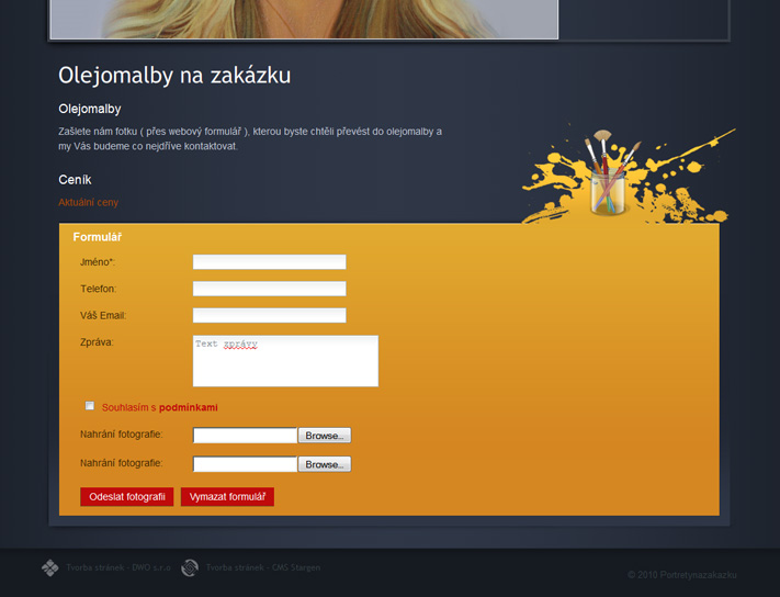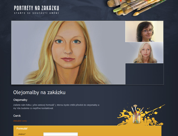 Naším cílem bylo vytvořit jednoduché stránky s možností objednávky pomocí webového formuláře. Stránky umožňují odeslat fotky určené pro zpracování do olejomalby a rychle se tak domluvit na zadání a bližším upřesnění činnosti.